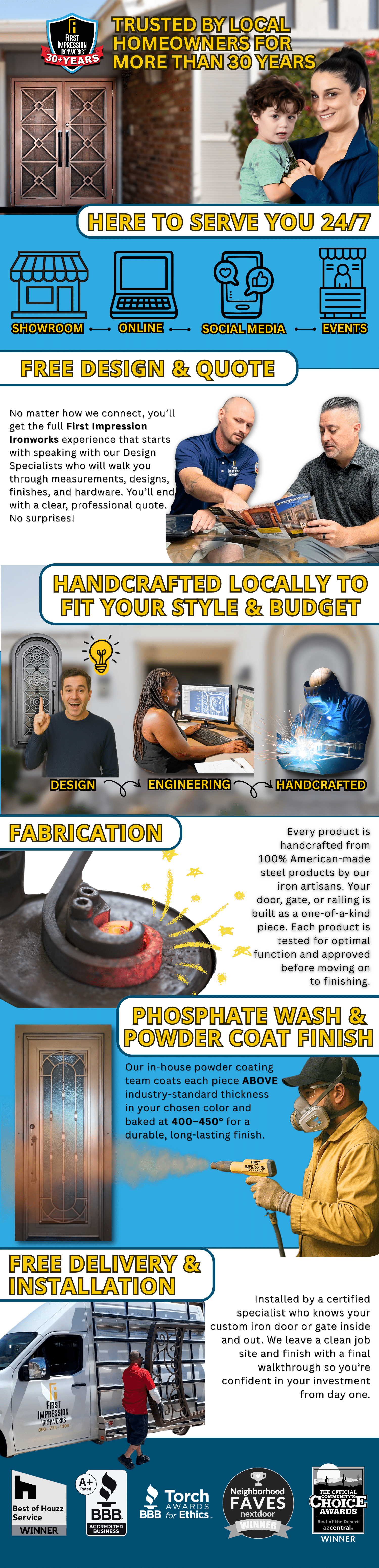 If you're considering upgrading your entry door or adding an iron security door, the difference between simply buying a door and experiencing a full-service journey can greatly impact your long-term satisfaction. First Impression Ironworks ensures that every step—from design consultation to manufacturing and installation—is seamless, transparent, and personalized. Backed by glowing testimonials and a strong commitment to quality, the process is as reassuring as the final product is impressive. With expert guidance, skilled craftsmanship, and dedicated support, homeowners can feel confident that their investment will provide beauty, security, and peace of mind for years to come.