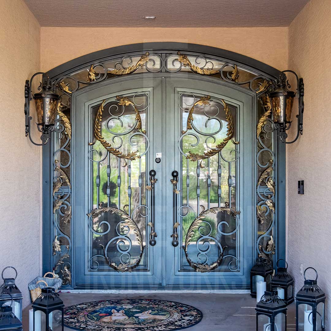 Iron Entry Doors from First Impression Ironworks are crafted uniquely for your home. Our steel entry doors are an investment that will truly add value to your home, since each door is custom built to your home’s specifications and made from the highest quality materials. Each wrought iron door, whether solid steel, iron and glass, or wrought iron and wood, is expertly made in Arizona by our talented iron artisans. Our wrought iron is sourced here in the U.S.A., using only 100% American steel. Every iron entry door is crafted from the strongest, most robust steel in the door, frame, iron pull handles, and even the standard 10" steel latch and lock guard. Name brand Kwikset or Schlage hardware is always included, so your new front door can be upgraded with the latest technology and integrated with alarm and monitoring systems. We’re here to bring your dreams to life with customization available for whatever needs fit your home best, whether it’s removable sunscreens, sidelights, transoms, or elegant iron hardware. Create the first impression you’ve always wanted for your home today with your vision and our expertise!