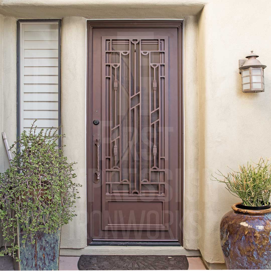 Iron Entry Doors from First Impression Ironworks are crafted uniquely for your home. Our steel entry doors are an investment that will truly add value to your home, since each door is custom built to your home’s specifications and made from the highest quality materials. Each wrought iron door, whether solid steel, iron and glass, or wrought iron and wood, is expertly made in Arizona by our talented iron artisans. Our wrought iron is sourced here in the U.S.A., using only 100% American steel. Every iron entry door is crafted from the strongest, most robust steel in the door, frame, iron pull handles, and even the standard 10" steel latch and lock guard. Name brand Kwikset or Schlage hardware is always included, so your new front door can be upgraded with the latest technology and integrated with alarm and monitoring systems. We’re here to bring your dreams to life with customization available for whatever needs fit your home best, whether it’s removable sunscreens, sidelights, transoms, or elegant iron hardware. Create the first impression you’ve always wanted for your home today with your vision and our expertise!