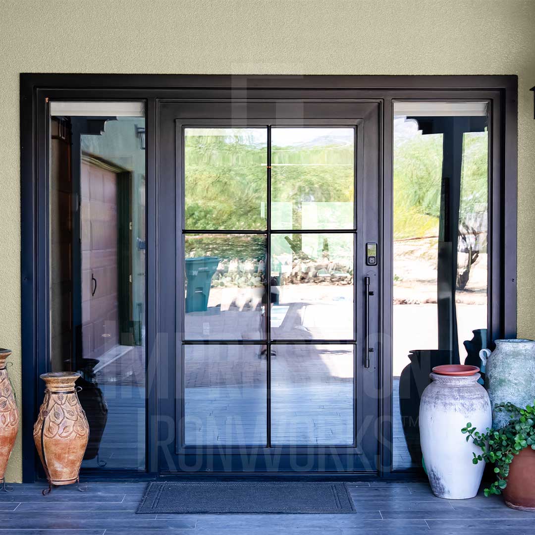 Iron Entry Doors from First Impression Ironworks are crafted uniquely for your home. Our steel entry doors are an investment that will truly add value to your home, since each door is custom built to your home’s specifications and made from the highest quality materials. Each wrought iron door, whether solid steel, iron and glass, or wrought iron and wood, is expertly made in Arizona by our talented iron artisans. Our wrought iron is sourced here in the U.S.A., using only 100% American steel. Every iron entry door is crafted from the strongest, most robust steel in the door, frame, iron pull handles, and even the standard 10" steel latch and lock guard. Name brand Kwikset or Schlage hardware is always included, so your new front door can be upgraded with the latest technology and integrated with alarm and monitoring systems. We’re here to bring your dreams to life with customization available for whatever needs fit your home best, whether it’s removable sunscreens, sidelights, transoms, or elegant iron hardware. Create the first impression you’ve always wanted for your home today with your vision and our expertise!