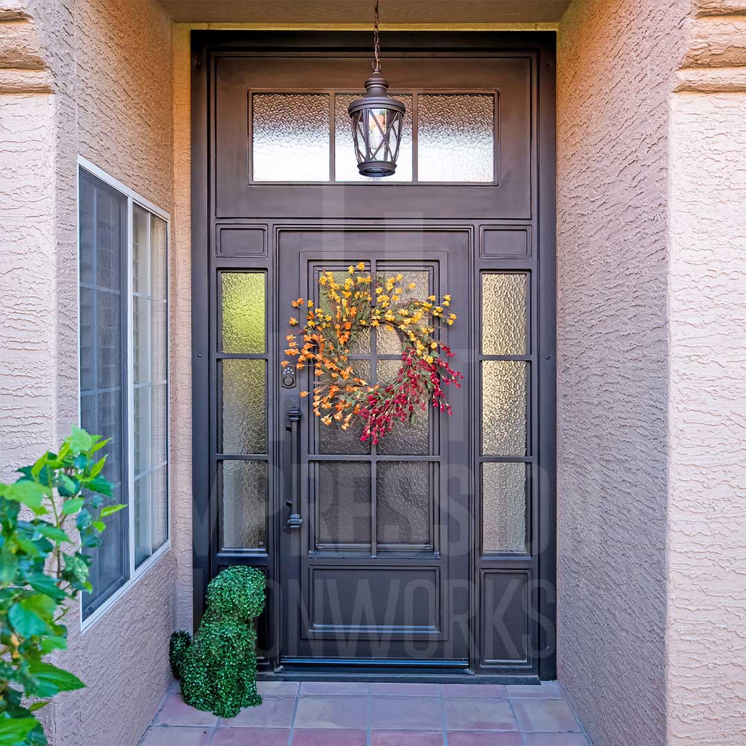 Iron Entry Doors from First Impression Ironworks are crafted uniquely for your home. Our steel entry doors are an investment that will truly add value to your home, since each door is custom built to your home’s specifications and made from the highest quality materials. Each wrought iron door, whether solid steel, iron and glass, or wrought iron and wood, is expertly made in Arizona by our talented iron artisans. Our wrought iron is sourced here in the U.S.A., using only 100% American steel. Every iron entry door is crafted from the strongest, most robust steel in the door, frame, iron pull handles, and even the standard 10" steel latch and lock guard. Name brand Kwikset or Schlage hardware is always included, so your new front door can be upgraded with the latest technology and integrated with alarm and monitoring systems. We’re here to bring your dreams to life with customization available for whatever needs fit your home best, whether it’s removable sunscreens, sidelights, transoms, or elegant iron hardware. Create the first impression you’ve always wanted for your home today with your vision and our expertise!