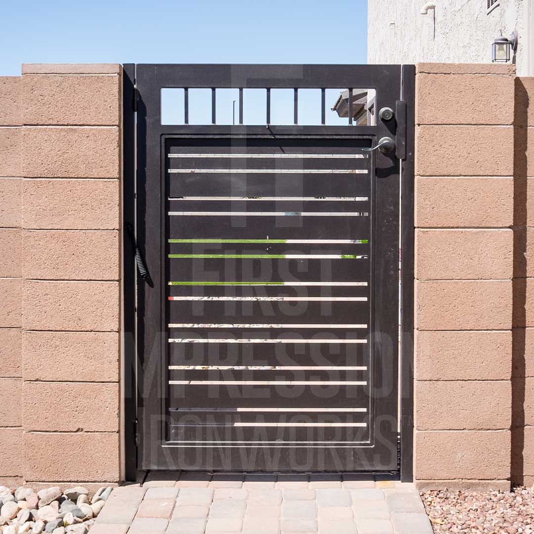 Every Iron & Wood Gate from First Impression Ironworks is designed to provide security and beauty to your home, and is always custom built to your home’s specifications. Each gate is made in Arizona from the highest quality materials sourced here in the U.S.A., using only 100% American steel.  Each Iron Gate is crafted from the most robust steel and gate posts available, as well as a standard 10” steel latch and lock guard, name brand Kwikset or Schlage hardware is always included, and customization is available for whatever needs fit your home best. Our product line includes a customizable array of steel plate gates, iron and wood gates, wrought iron and glass, or timeless iron and redwood gates. You can choose your Iron Gate from a variety of styles such as Contemporary, Traditional and Tuscan, and with additional options such as arches or digital locks. Our design consultants are here to help – let us know how we can create a one-of-a-kind Iron Gate for your home today!