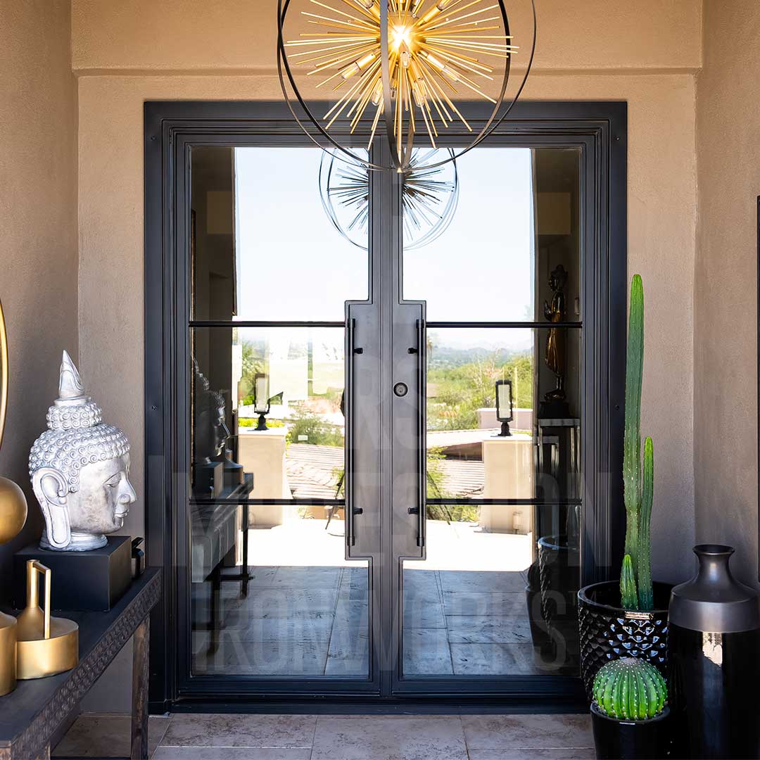 Iron Entry Doors from First Impression Ironworks are crafted uniquely for your home. Our steel entry doors are an investment that will truly add value to your home, since each door is custom built to your home’s specifications and made from the highest quality materials. Each wrought iron door, whether solid steel, iron and glass, or wrought iron and wood, is expertly made in Arizona by our talented iron artisans. Our wrought iron is sourced here in the U.S.A., using only 100% American steel. Every iron entry door is crafted from the strongest, most robust steel in the door, frame, iron pull handles, and even the standard 10" steel latch and lock guard. Name brand Kwikset or Schlage hardware is always included, so your new front door can be upgraded with the latest technology and integrated with alarm and monitoring systems. We’re here to bring your dreams to life with customization available for whatever needs fit your home best, whether it’s removable sunscreens, sidelights, transoms, or elegant iron hardware. Create the first impression you’ve always wanted for your home today with your vision and our expertise!