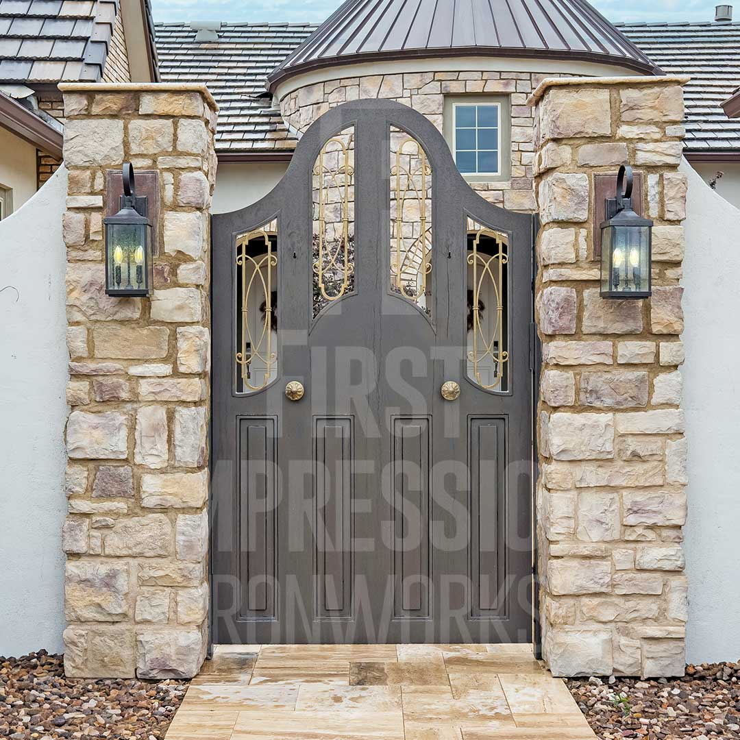Custom Exclusive Iron Gate Every Iron & Wood Gate from First Impression Ironworks is designed to provide security and beauty to your home, and is always custom built to your home’s specifications. Each gate is made in Arizona from the highest quality materials sourced here in the U.S.A., using only 100% American steel.  Each Iron Gate is crafted from the most robust steel and gate posts available, as well as a standard 10” steel latch and lock guard, name brand Kwikset or Schlage hardware is always included, and customization is available for whatever needs fit your home best. Our product line includes a customizable array of steel plate gates, iron and wood gates, wrought iron and glass, or timeless iron and redwood gates. You can choose your Iron Gate from a variety of styles such as Contemporary, Traditional and Tuscan, and with additional options such as arches or digital locks. Our design consultants are here to help – let us know how we can create a one-of-a-kind Iron Gate for your home today!