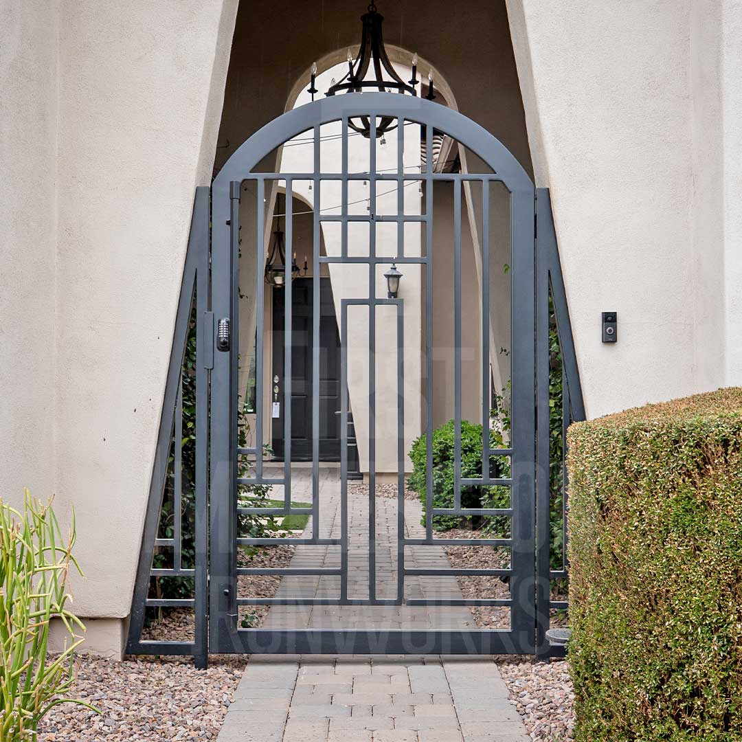 Every Iron & Wood Gate from First Impression Ironworks is designed to provide security and beauty to your home, and is always custom built to your home’s specifications. Each gate is made in Arizona from the highest quality materials sourced here in the U.S.A., using only 100% American steel.  Each Iron Gate is crafted from the most robust steel and gate posts available, as well as a standard 10” steel latch and lock guard, name brand Kwikset or Schlage hardware is always included, and customization is available for whatever needs fit your home best. Our product line includes a customizable array of steel plate gates, iron and wood gates, wrought iron and glass, or timeless iron and redwood gates. You can choose your Iron Gate from a variety of styles such as Contemporary, Traditional and Tuscan, and with additional options such as arches or digital locks. Our design consultants are here to help – let us know how we can create a one-of-a-kind Iron Gate for your home today!