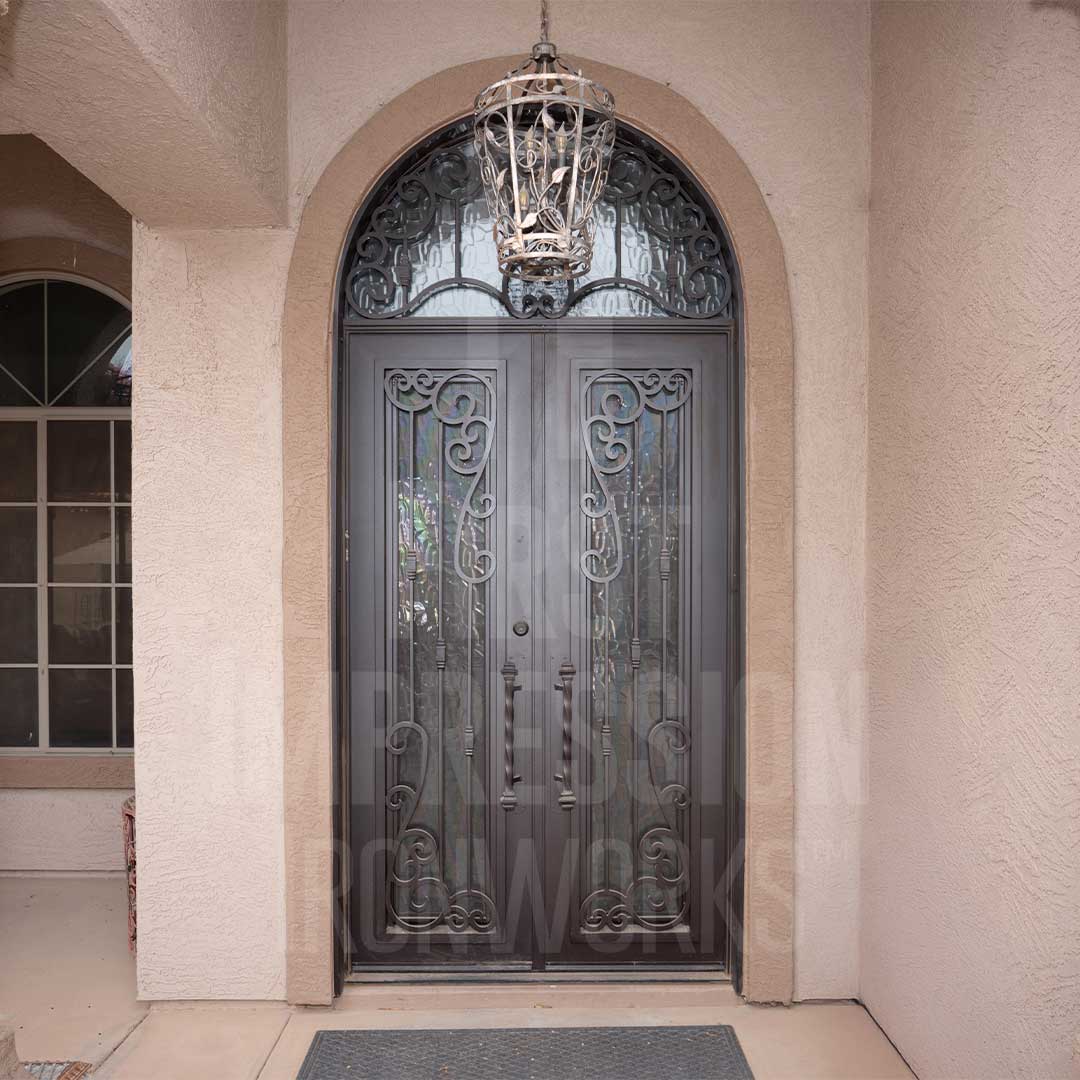 Iron Entry Doors from First Impression Ironworks are crafted uniquely for your home. Our steel entry doors are an investment that will truly add value to your home, since each door is custom built to your home’s specifications and made from the highest quality materials. Each wrought iron door, whether solid steel, iron and glass, or wrought iron and wood, is expertly made in Arizona by our talented iron artisans. Our wrought iron is sourced here in the U.S.A., using only 100% American steel. Every iron entry door is crafted from the strongest, most robust steel in the door, frame, iron pull handles, and even the standard 10" steel latch and lock guard. Name brand Kwikset or Schlage hardware is always included, so your new front door can be upgraded with the latest technology and integrated with alarm and monitoring systems. We’re here to bring your dreams to life with customization available for whatever needs fit your home best, whether it’s removable sunscreens, sidelights, transoms, or elegant iron hardware. Create the first impression you’ve always wanted for your home today with your vision and our expertise!