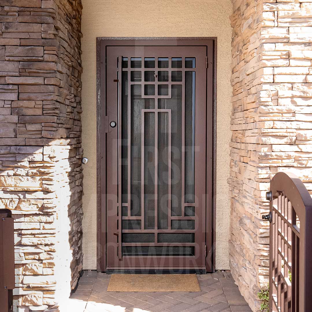 Elevate your Arizona home’s entrance with a custom Iron Security Screen Door from First Impression Ironworks. Combining beauty, strength, and security, our doors are built to provide the highest security of any screen, storm, or security door - while adding lasting value. Each iron security door is crafted to your exact specifications using 100% American-made steel products and handcrafted right here in Gilbert, Arizona. Our 14-gauge steel security doors feature a full steel frame, durable iron pull handles, and a robust 10” steel latch and lock guard for unmatched security. Choose from solid steel, steel with glass, or wrought iron and wood designs, all tailored to your home’s style and budget. Enhance your security door with premium Kwikset or Schlage hardware, or upgrade with integrated alarm and monitoring systems. Customize further with options like kick plates, removable sunscreens, powder-coated steel frames, sidelights, transoms, and elegant iron pull handles. With expert craftsmanship and personalized designs, we’ll help you create the first impression you’ve always dreamed of. Let’s bring your vision to life today!