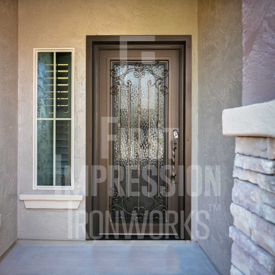Enhance your Texas home’s entrance with a custom Iron Entry Door from First Impression Ironworks. Your door will be uniquely crafted to match your vision. Designed for lasting value, your steel entry door will be custom-built to your home’s specifications using the highest quality materials. Whether you choose solid steel, iron and glass, or wrought iron and wood, every door is expertly handcrafted in America by skilled artisans. Our doors are all 100% American-made steel products. Every entry door is constructed with the most durable steel, from the frame to the iron pull handles and the standard 10-inch steel latch and lock guard for superior protection. Premium Kwikset or Schlage hardware is always included, with options to upgrade to the latest security technology, including alarm and monitoring integration. Personalize your door with features such as removable sunscreens, sidelights, transoms, or elegant iron detailing. With expert craftsmanship and tailored designs, we bring your vision to life, ensuring a grand first impression for your home. Let’s create something exceptional together!