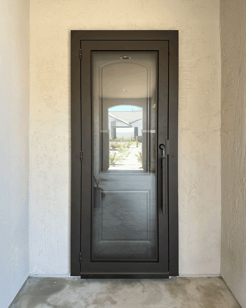 Make a dramatic statement at your Texas home with a custom Iron Security Screen Door from First Impression Ironworks. Designed for both elegance and protection, our doors offer superior security compared to traditional screen, storm, or security doors—while enhancing your home’s value. Each door is expertly handcrafted right here in the USA, and is thereby a 100% American-made steel product. Your door will be tailored precisely to your home’s specifications. Our 14-gauge steel doors feature a fully welded steel frame, durable iron pull handles, and a formidable 10-inch steel latch and lock guard for unbeatable security. Select from solid steel, steel with glass, or wrought iron and wood designs, all crafted to complement your home’s unique style and budget. Customize your security door with premium Kwikset or Schlage hardware, integrated alarm and monitoring systems, kick plates, removable sunscreens, powder-coated steel finishes and elegant iron detailing. With expert artistry and custom designs, we’re here to transform your entrance into a striking first impression. Let’s bring your vision.