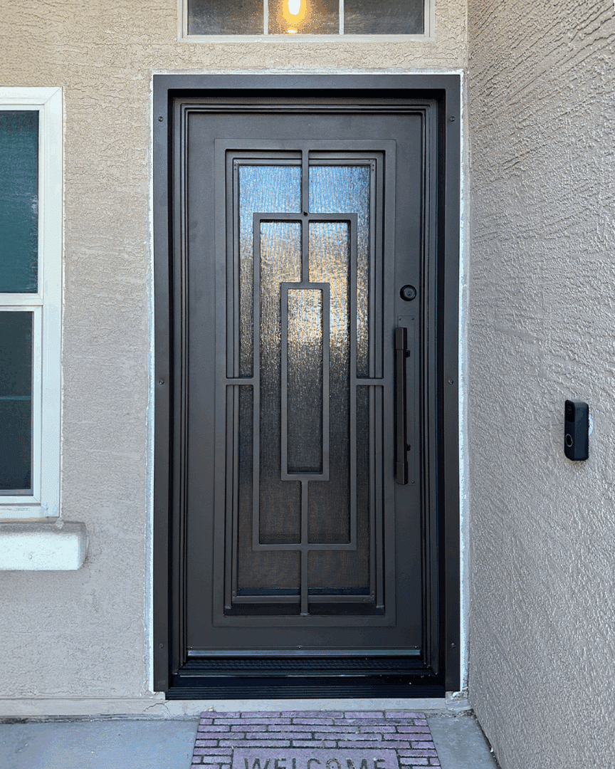 Enhance your Texas home’s entrance with a custom Iron Entry Door from First Impression Ironworks. Your door will be uniquely crafted to match your vision. Designed for lasting value, your steel entry door will be custom-built to your home’s specifications using the highest quality materials. Whether you choose solid steel, iron and glass, or wrought iron and wood, every door is expertly handcrafted in America by skilled artisans. Our doors are all 100% American-made steel products. Every entry door is constructed with the most durable steel, from the frame to the iron pull handles and the standard 10-inch steel latch and lock guard for superior protection. Premium Kwikset or Schlage hardware is always included, with options to upgrade to the latest security technology, including alarm and monitoring integration. Personalize your door with features such as removable sunscreens, sidelights, transoms, or elegant iron detailing. With expert craftsmanship and tailored designs, we bring your vision to life, ensuring a grand first impression for your home. Let’s create something exceptional together!