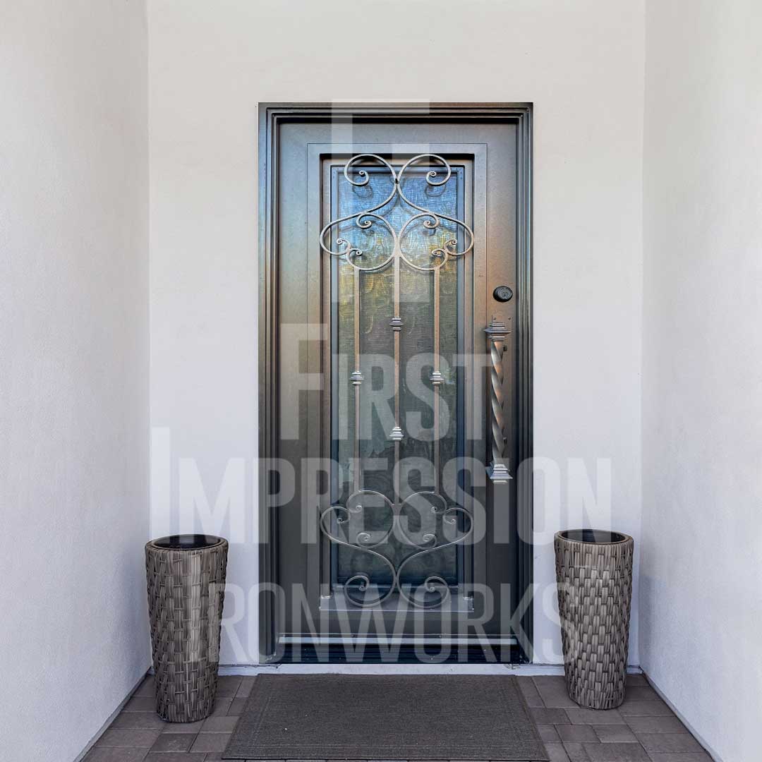 Enhance your Texas home’s entrance with a custom Iron Entry Door from First Impression Ironworks. Your door will be uniquely crafted to match your vision. Designed for lasting value, your steel entry door will be custom-built to your home’s specifications using the highest quality materials. Whether you choose solid steel, iron and glass, or wrought iron and wood, every door is expertly handcrafted in America by skilled artisans. Our doors are all 100% American-made steel products. Every entry door is constructed with the most durable steel, from the frame to the iron pull handles and the standard 10-inch steel latch and lock guard for superior protection. Premium Kwikset or Schlage hardware is always included, with options to upgrade to the latest security technology, including alarm and monitoring integration. Personalize your door with features such as removable sunscreens, sidelights, transoms, or elegant iron detailing. With expert craftsmanship and tailored designs, we bring your vision to life, ensuring a grand first impression for your home. Let’s create something exceptional together!