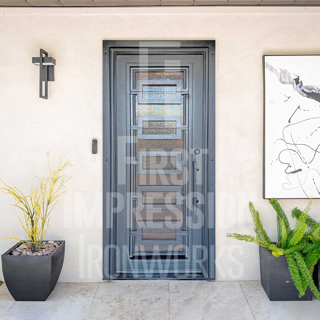 Enhance your Texas home’s entrance with a custom Iron Entry Door from First Impression Ironworks. Your door will be uniquely crafted to match your vision. Designed for lasting value, your steel entry door will be custom-built to your home’s specifications using the highest quality materials. Whether you choose solid steel, iron and glass, or wrought iron and wood, every door is expertly handcrafted in America by skilled artisans. Our doors are all 100% American-made steel products. Every entry door is constructed with the most durable steel, from the frame to the iron pull handles and the standard 10-inch steel latch and lock guard for superior protection. Premium Kwikset or Schlage hardware is always included, with options to upgrade to the latest security technology, including alarm and monitoring integration. Personalize your door with features such as removable sunscreens, sidelights, transoms, or elegant iron detailing. With expert craftsmanship and tailored designs, we bring your vision to life, ensuring a grand first impression for your home. Let’s create something exceptional together!