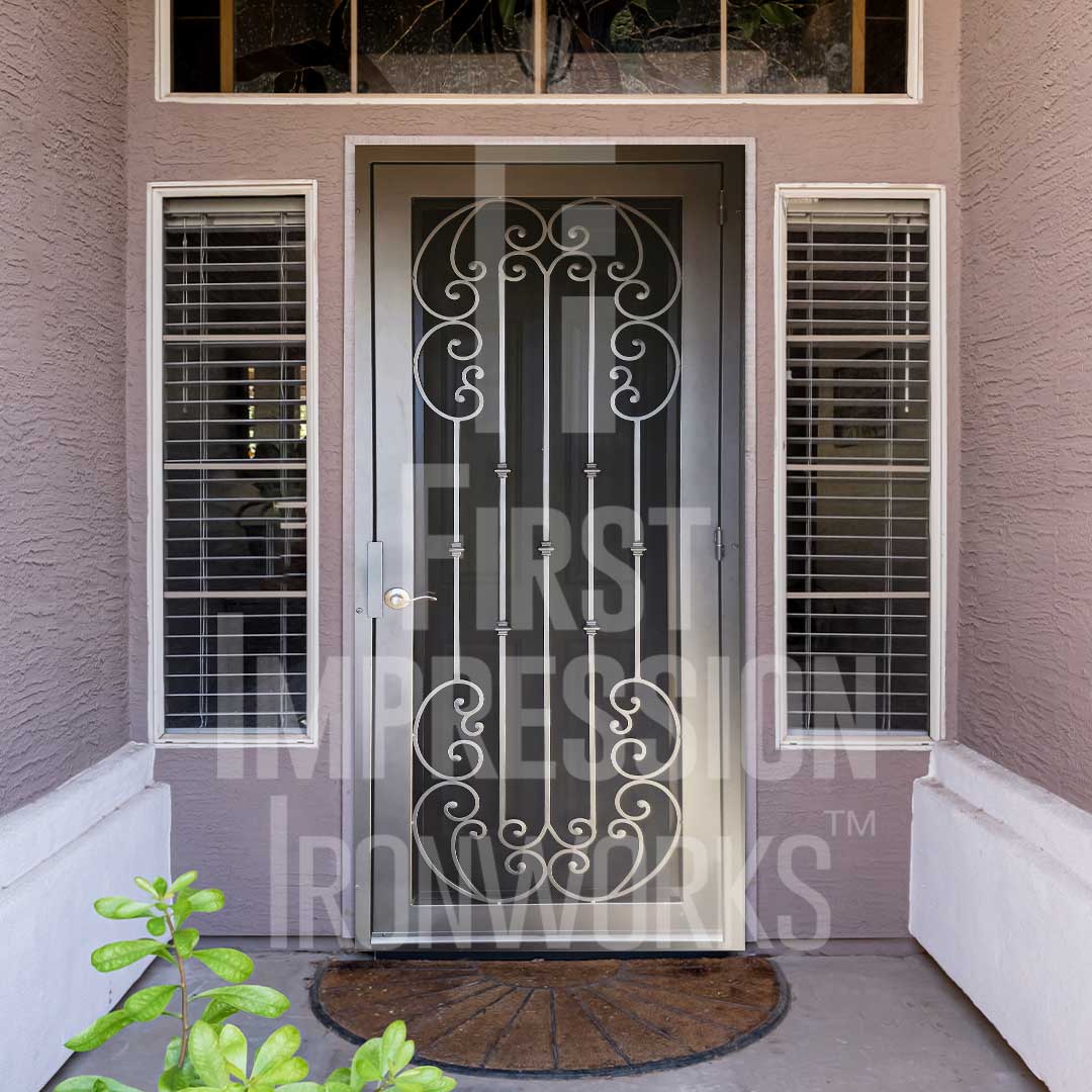Elevate your Arizona home’s entrance with a custom Iron Security Screen Door from First Impression Ironworks. Combining beauty, strength, and security, our doors are built to provide the highest security of any screen, storm, or security door - while adding lasting value. Each iron security door is crafted to your exact specifications using 100% American-made steel products and handcrafted right here in Gilbert, Arizona. Our 14-gauge steel security doors feature a full steel frame, durable iron pull handles, and a robust 10” steel latch and lock guard for unmatched security. Choose from solid steel, steel with glass, or wrought iron and wood designs, all tailored to your home’s style and budget. Enhance your security door with premium Kwikset or Schlage hardware, or upgrade with integrated alarm and monitoring systems. Customize further with options like kick plates, removable sunscreens, powder-coated steel frames, sidelights, transoms, and elegant iron pull handles. With expert craftsmanship and personalized designs, we’ll help you create the first impression you’ve always dreamed of. Let’s bring your vision to life today!